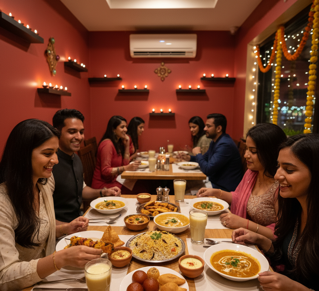 Diwali, the festival of lights, is one of the most eagerly awaited celebrations of the year. The restaurant transforms into a glowing haven filled with lamps, rangoli patterns, and the aroma of sweets and spices. The menu bursts with festive favorites such as samosas, paneer tikka, dal makhani, and gulab jamun—dishes that represent the richness of Indian hospitality.
